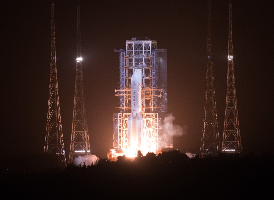 11月24日4时30分,我国在中国文昌航天发射场,用长征五号遥五运载火箭成功发射探月工程嫦娥五号探测器,火箭飞行约2200秒后,顺利将探测器送入预定轨道,开启我国首次地外天体采样返回之旅。这是长征五号遥五运载火箭发射。
