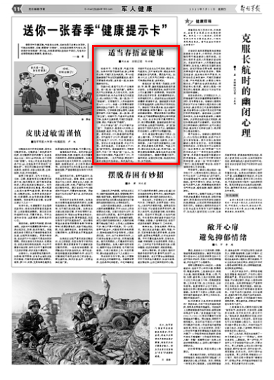 此外,春捂还要注意以下两点:注重上薄下厚。天气转暖后,很多人习惯先脱掉厚重的绒裤、毛裤等,只穿一条单裤。人体下部的血液循环比上部差,更容易遭受风寒侵袭。气温上升后,建议战友先减上装,再减下装。还要注意加强锻炼,增强机体的适应能力和抗病能力。锻炼时要量力而行、循序渐进,切莫过快过猛,造成肌肉拉伤、关节受损。