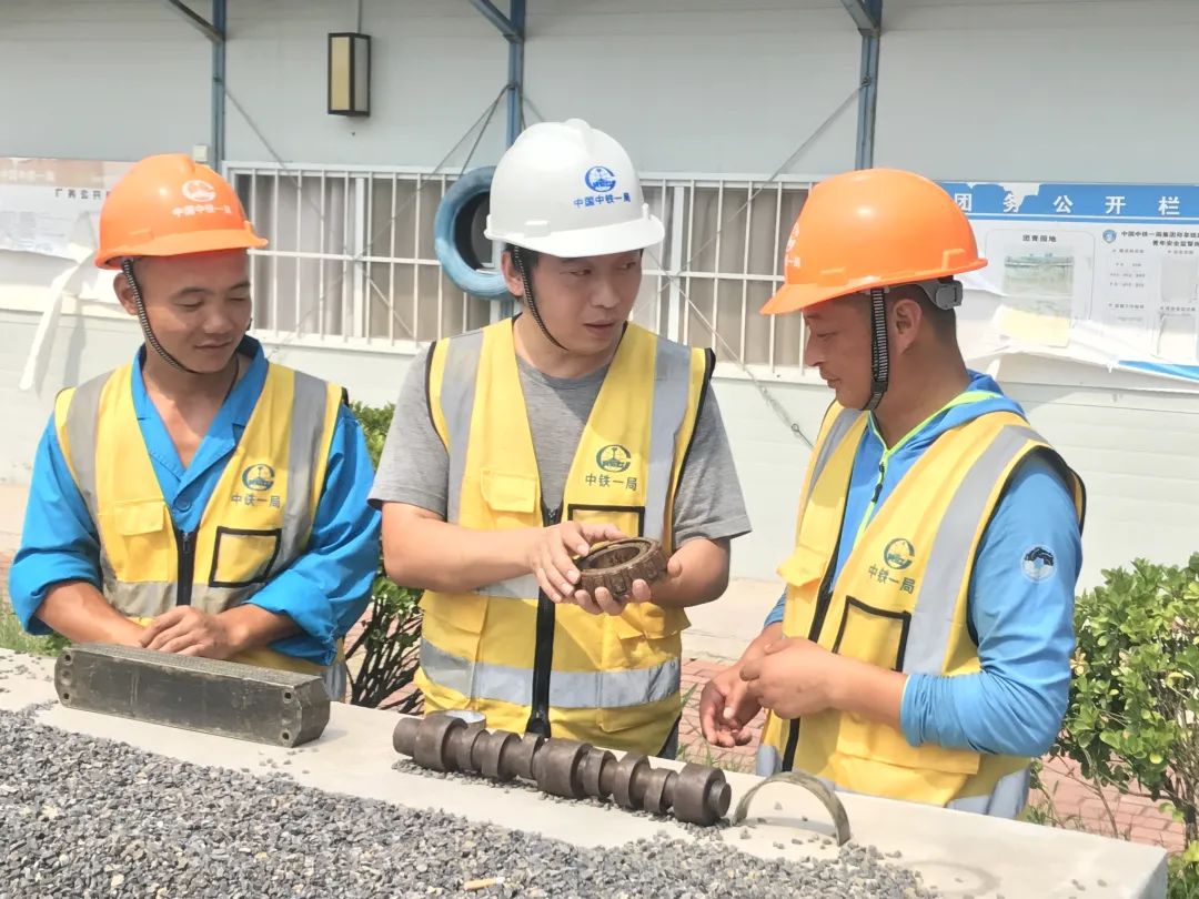 郝铎(左二)向工友们讲解架桥机零件的相关知识。