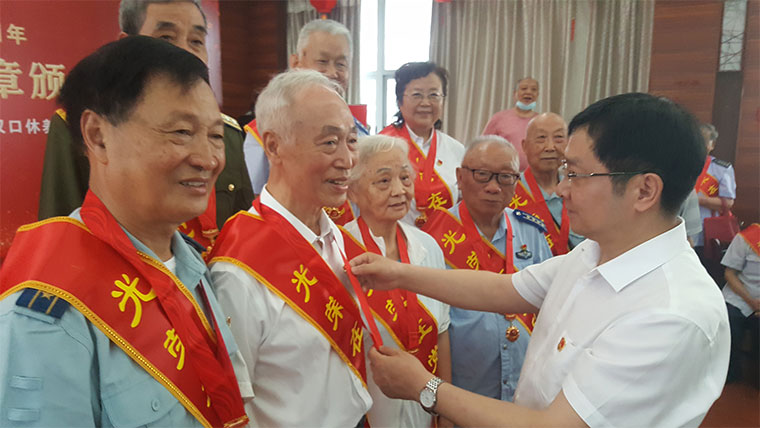 6月29日,在宏伟雄壮的《国际歌》乐曲声中,湖北省退役军人事务厅直属汉口军休所为79位“光荣在党50年”的老战士举行隆重的授戴、颁发纪念章仪式。图为湖北省退役军人事务厅副厅长周绪铎给该所年龄最大的老战士敖厚德(88岁,党龄68年)及其夫人张翊梅(前排左三)颁发光荣纪念章。 周凤仪 摄