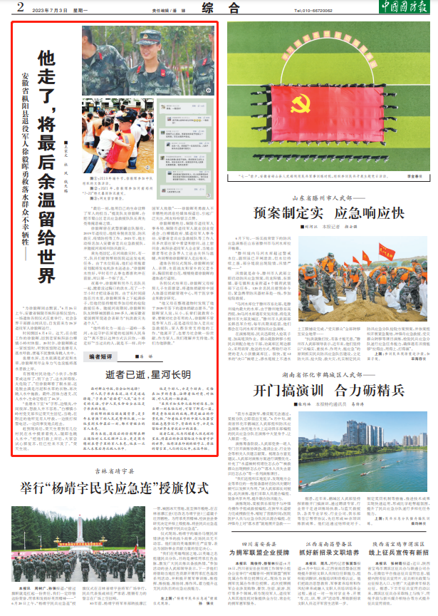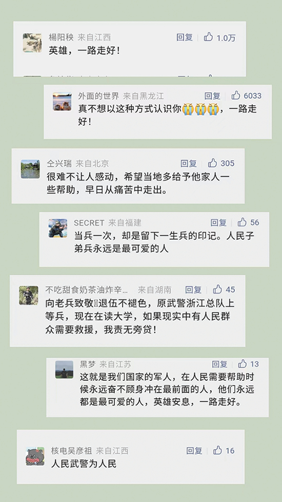 “他终将化为一座山一道岭一条河,永远守护在深爱的祖国和人民身边”“真不想以这种方式认识你,一路走好”“当过兵的人,就是不一样,向中国军人致敬”……徐毅晖英勇救人不幸牺牲的消息经媒体报道后,引起广泛关注,网友纷纷留言点赞。