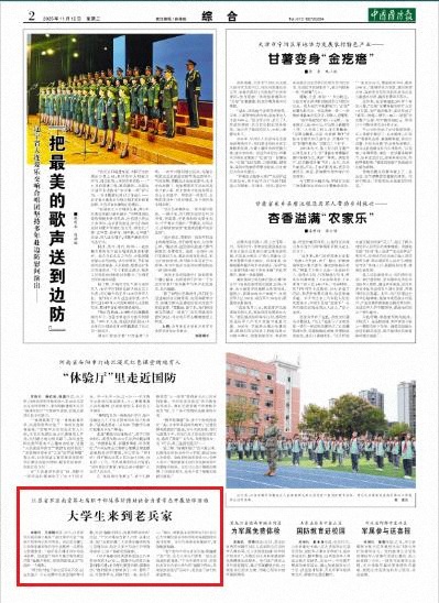 中国国防报讯 王聪颖报道:近日,江苏省军区南京第七离职干部休养所的老干部家中常常传出欢声笑语。来自南京理工大学钱学森学院的学生志愿者一边帮老人做着家务,一边听老人讲述当年的战斗故事。这是该干休所与地方高校联合开展“温暖夕阳红,我来陪您说说话”活动的一个缩影。