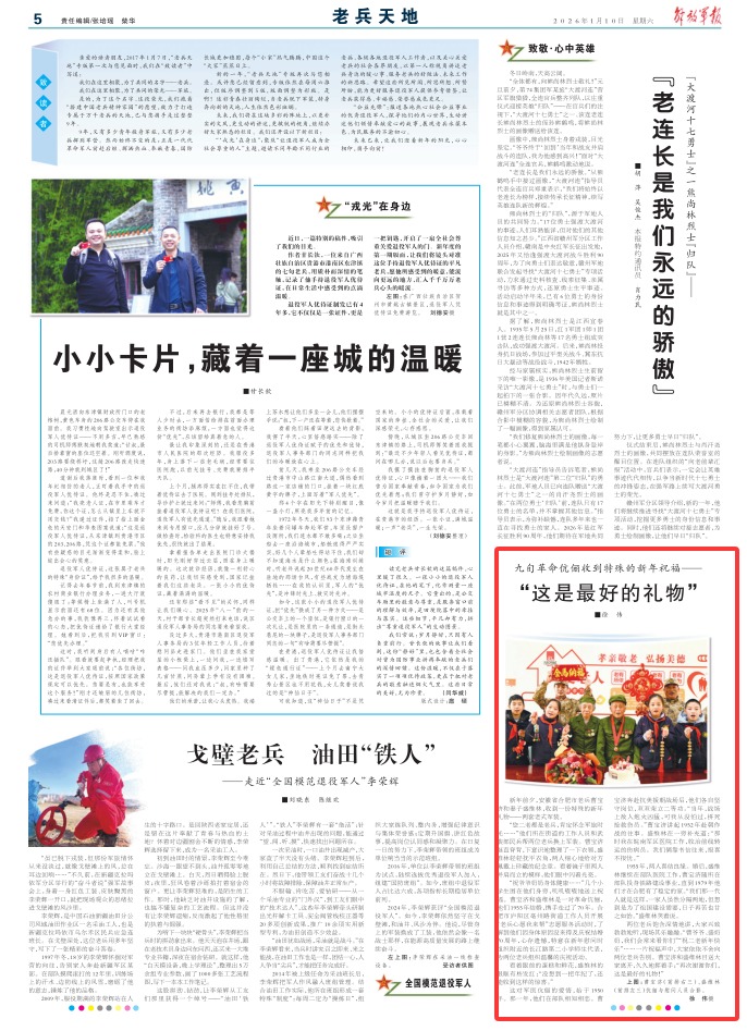 “您二老都是老兵,肯定怀念军旅时光……”他们所在街道的工作人员和武装部民兵帮两位老兵换上军装。曹宝济挺直脊背,下意识地整理了一下衣领,盛维林轻轻抚平衣角,两人细心地给对方佩戴上珍藏的纪念章。看着镜子里两人并肩而立的模样,他们眼中闪着光亮。