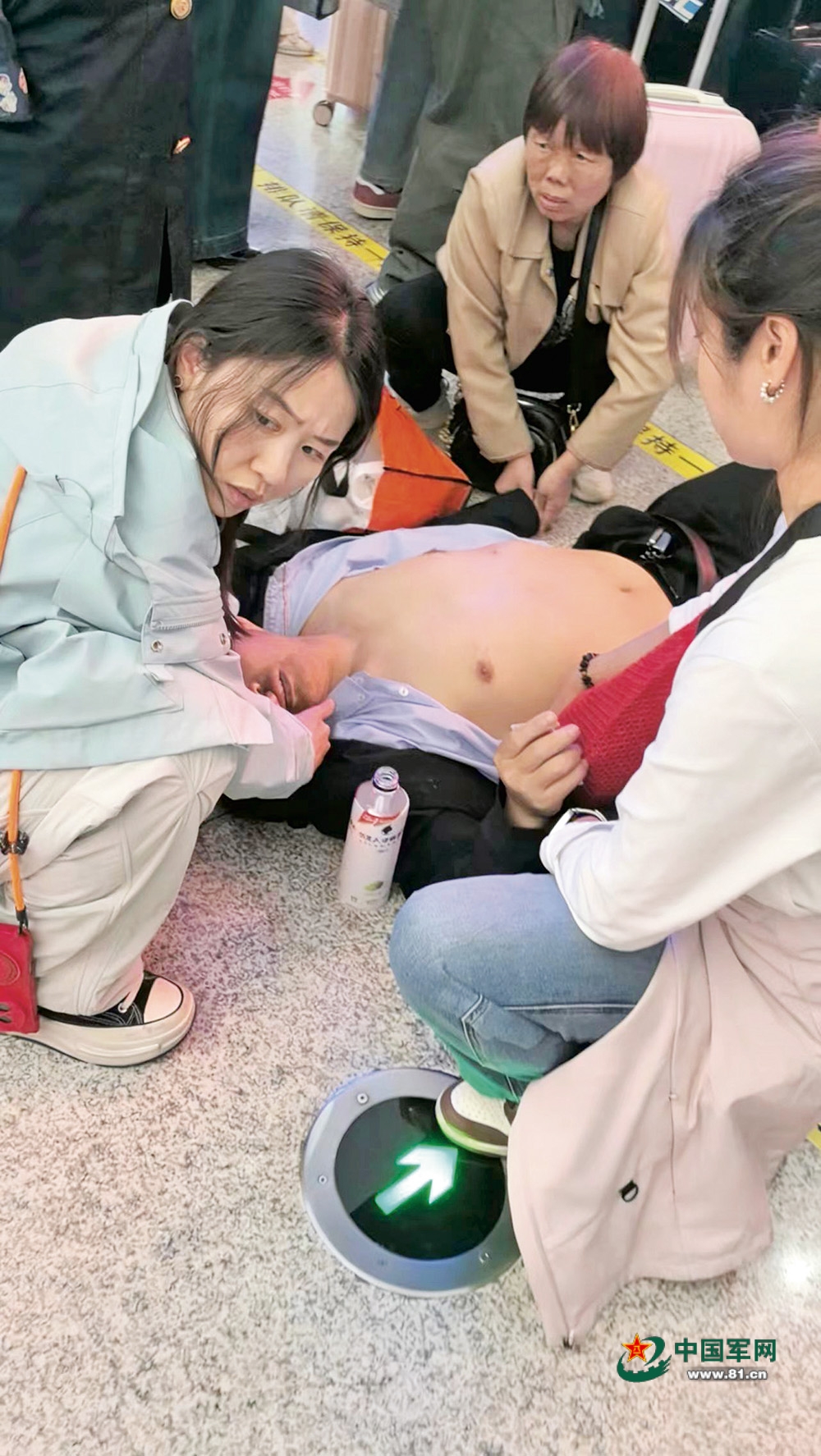 2月24日傍晚,徐艳丽(左一)在高铁站为倒地男子进行急救。钟洁 摄