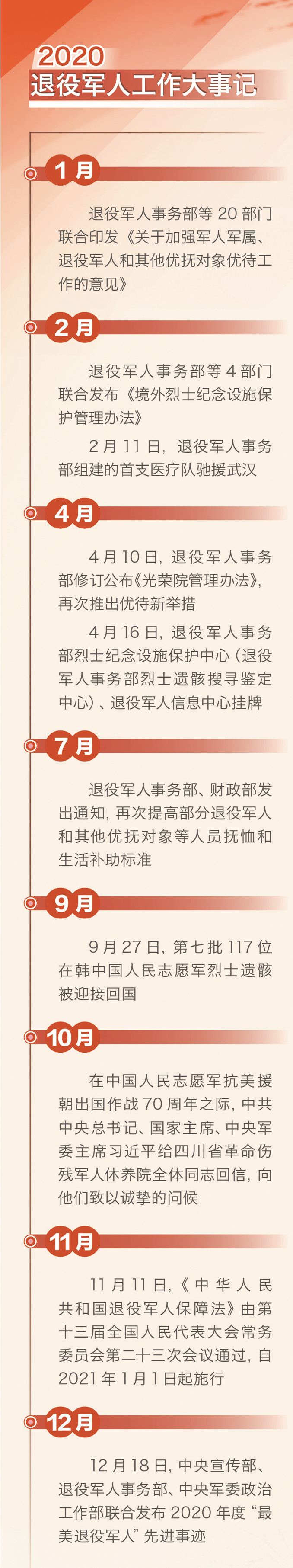 2020年,《境外烈士纪念设施保护管理办法》、新修订的《光荣院管理办法》和《关于进一步推动抚恤优待政策落地见效的通知》等先后发布印发。目前,中央层面已出台政策性文件52件,指导地方配套出台细化政策措施近600件,退役军人工作政策制度体系建设加快推进。