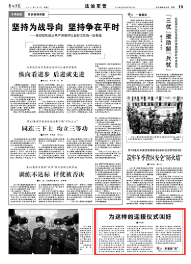 将迎接仪式纳入法律范畴,以往未有。过去,新兵参军入伍时披红戴花、敲锣打鼓,无限风光,而老兵退役回乡时却冷冷清清,少有问津。这容易让一些退役老兵产生失落感。现在,老兵们服役期满光荣返乡时,有地方政府领导到码头、车站、机场迎接,有“欢迎子弟兵回到故乡建设家乡”等内容的条幅标语,有退役军人就业创业的各种优惠政策,让重返故乡的老兵心里感受到温暖。