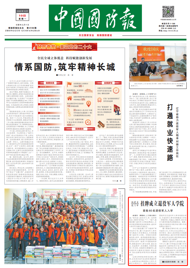 中国国防报讯 周晓松、记者徐文涛报道:“再次进入高校学习,我一定珍惜机会,争取学有所成。”“十一”前夕,福建省厦门退役军人学院挂牌成立,在该学院首期师资培训班现场,退役军人原月作为新生代表发言。