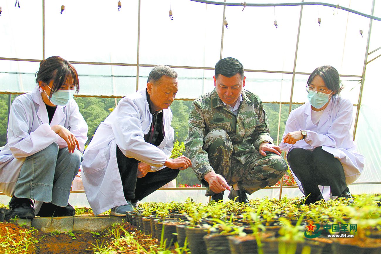 退役军人蔡志林(右二)带领科研团队观察“太空刺梨种子”幼芽长势。赵婵娟提供