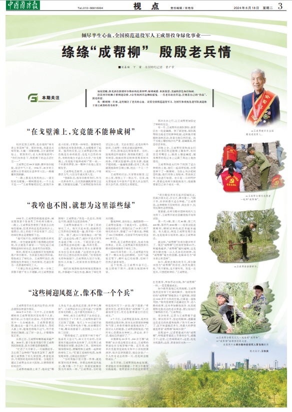 “只要让我在这种树,我一分钱工资都不要!”有人不理解,问王成帮到底图啥?王成帮说:“我是一名老兵,我啥也不图,就想为这里添些绿。”