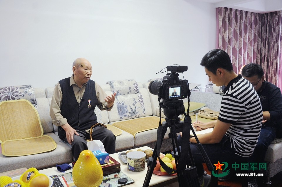 在浙江省宁波市,工作人员听抗战老兵鲍子文讲述战斗故事。莫 非摄