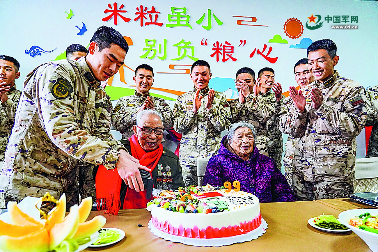 “盼着你们把打仗本领练过硬,好好保卫咱们的国家!”在官兵们的见证下,杨明许下98岁生日愿望。随后,他切开生日蛋糕,将蛋糕分到在场官兵手中。