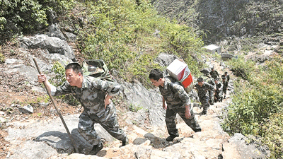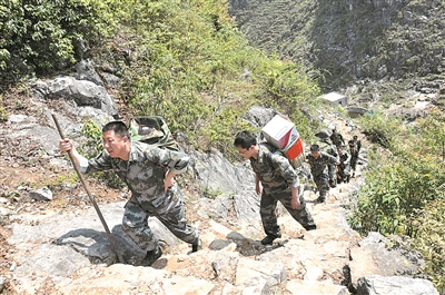 几年前,背篼是扶贫干部的“标配”,人武部干部职工帮群众将生活物资背进村寨。赵温祥摄(本报资料照片,2014年5月21日刊用)