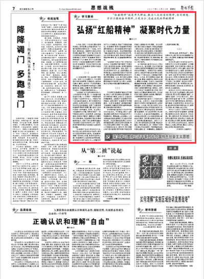 习主席把“红船精神”概括为开天辟地、敢为人先的首创精神,坚定理想、百折不挠的奋斗精神,立党为公、忠诚为民的奉献精神。这既是对“红船精神”的科学概括,也是对践行“红船精神”的明确要求。请关注今日《解放军报》刊发的文章——