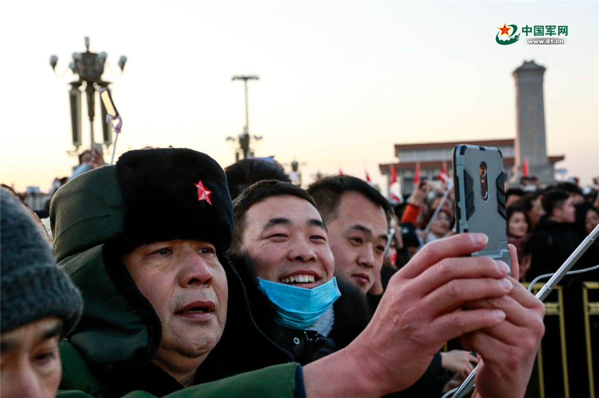 现场群众在记录升旗仪式。清晨的寒冷阻挡不了他们迎接国旗的热情。中国军网记者 冯开华 摄