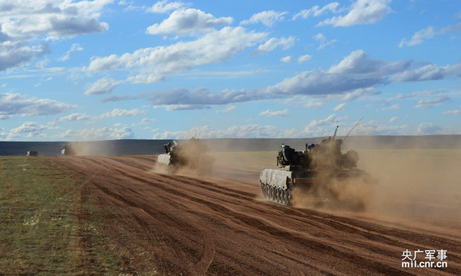 6月17日,总参“跨越-2014B”实兵对抗演习在朱日和训练基地进行实战背景下综合检验,广州军区某装甲旅进行了一场全要素、实战化实弹射击演练。