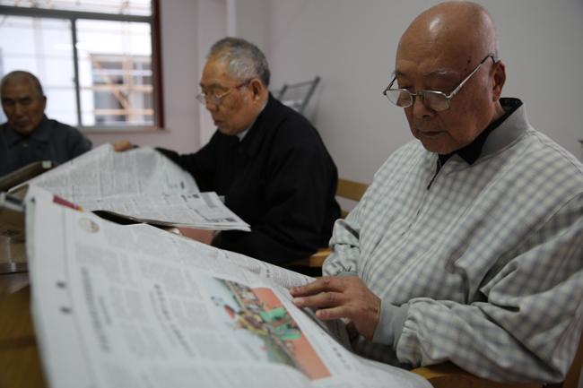在新建成的文化活动中心读报下棋,提高了老干部的业余文化生活