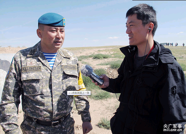 联演联合战役指挥部副指挥员、哈萨克斯坦国防部航空训练局局长穆兹杜巴耶夫上校(左)在接受记者穆亮龙(右)采访时表示,通过这样的联合演习,参演各方可以交流经验,相互学习。对哈萨克斯坦来说,可以提高他们的作战能力和作战水平。
