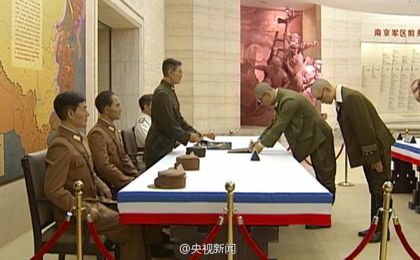 南京军区用高仿真硅胶人像复原了1945年“受降仪式”现场。在复原场景中,日本中国派遣军总司令冈村宁次正向中国陆军总司令何应钦递交投降书。这些硅胶人像逼真度远超蜡像,复原场景也是根据史料制作。