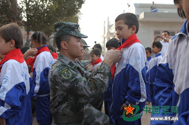 官兵为驻地小学生系上红领巾。