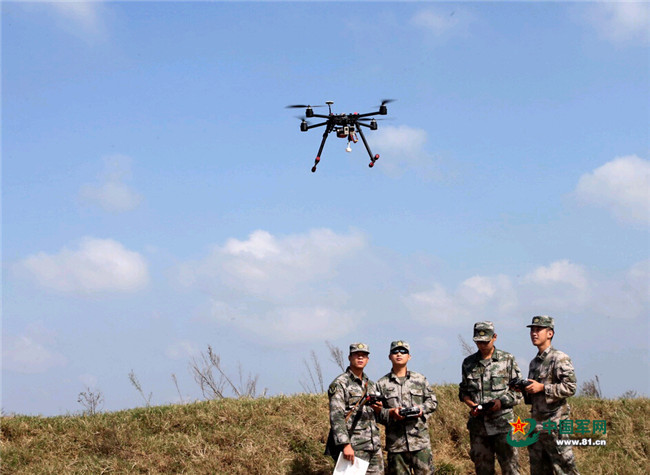 9月21日上午,济南军区某炮兵旅自行火炮营到达预定展开地域后,放飞自购的4旋翼无人机对“敌”前沿实施空中侦察。 记者 乔天富摄