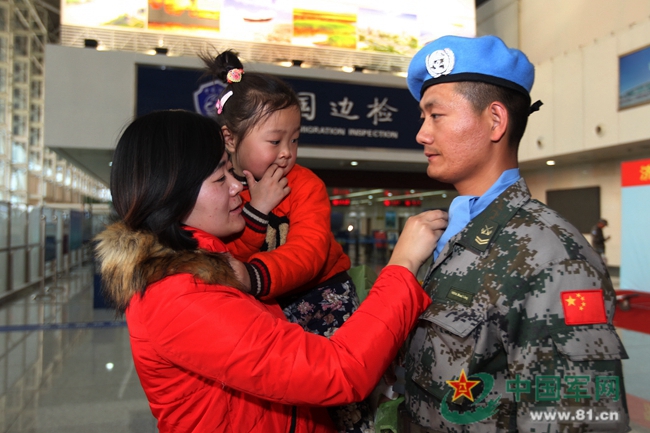 韩兴第5次出国维和,妻子肖丛丛带着4岁的女儿到机场送行。