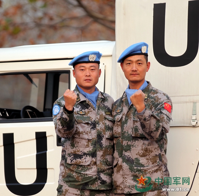连续5次参加维和的上士程玉仁(左)和四级军士长韩兴