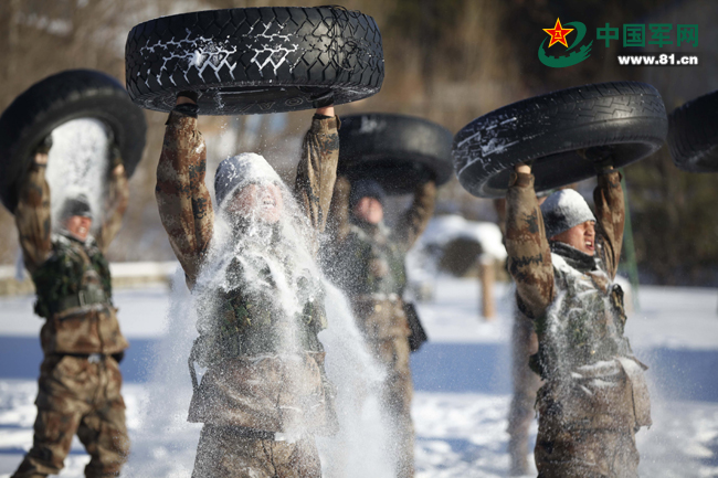 12月24日,黑龙江黑河市,黑龙江省军区某边防团11连战士冒着-31℃严寒气温组织开展抗圆木、托举轮胎、腾空前扑等科目训练。入冬后,从难从严从实战要求出发摔打部队。魏建顺摄