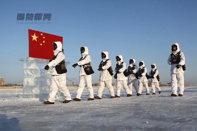1月3日,地处北纬50度边境线上的“黑河好八连”戍边官兵冒着严寒气温在中俄边境线上巡逻执勤。