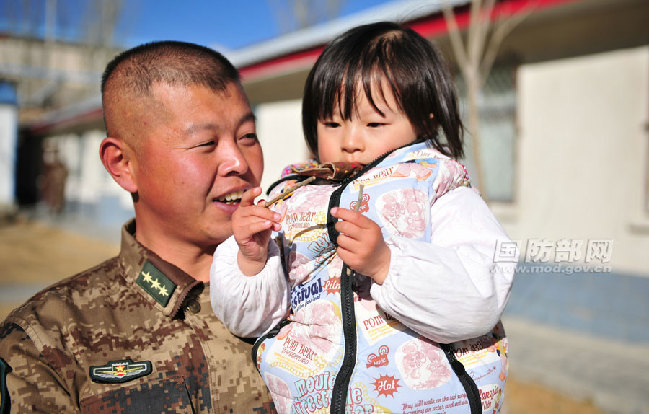 某边防团车队队长包建东抱着女儿包静萱心里无比快乐。李伟明