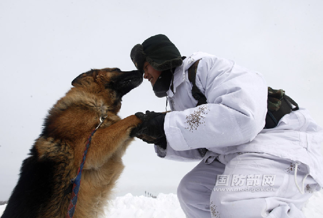 3月1日,哨兵薛颜俊给军犬小龙暖脚后,小龙主动亲吻薛颜俊的脸颊表示感谢。