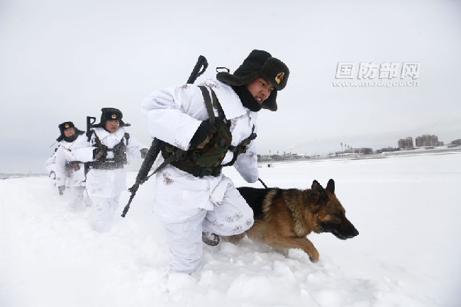 3月1日,“黑河好八连”哨兵踏着积雪巡逻在边境线上。此时的积雪厚度对军犬小龙来说已经过膝盖了。巡逻中,小龙走在队伍的最前面,趟开被寒风吹得有些生硬的积雪。