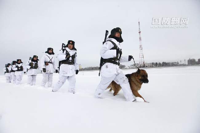 3月1日,“黑河好八连”哨兵踏着积雪巡逻在边境线上。
