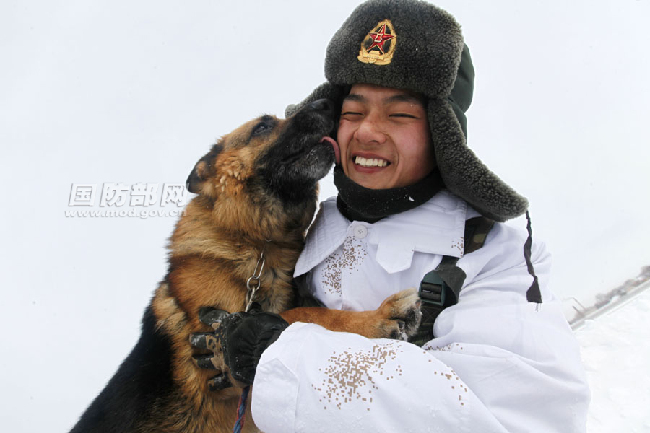 3月1日,哨兵薛颜俊给军犬小龙暖脚后,小龙主动献吻。