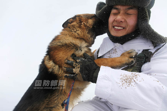 军犬小龙有意地将嘴巴对准薛颜俊的耳朵,似乎在说着悄悄话。