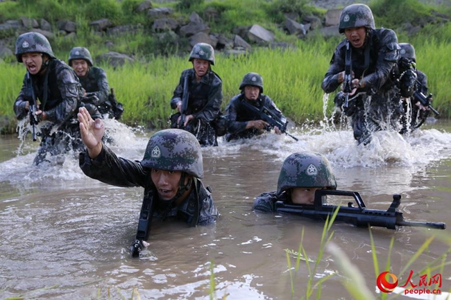 在泥水潭中,官兵们时而腾空而击,时而捕俘倒地,时而绝地反击……塘底,深层黑色烂泥被他们不断搅动掀起,传来阵阵腐臭的味道,让训练添加了肃杀之气,血肉之躯不断撞击大地,漂亮的丛林迷彩早成泥衣,让他们每个动作都显得十分吃力。