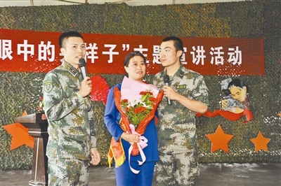 坦克四连上等兵李浩波的母亲刚要发言,战士付慧就跑上前献上一束鲜花:“阿姨,没有李班长的精心照料,今天我就不可能站在这里。”