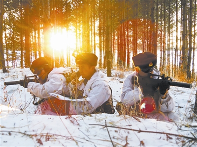冬日飞雪,由指导员调整到连长岗位上的沈阳军区某装甲旅警侦连连长高伟(中),正在带领战士们进行侦查训练。翁伟立摄