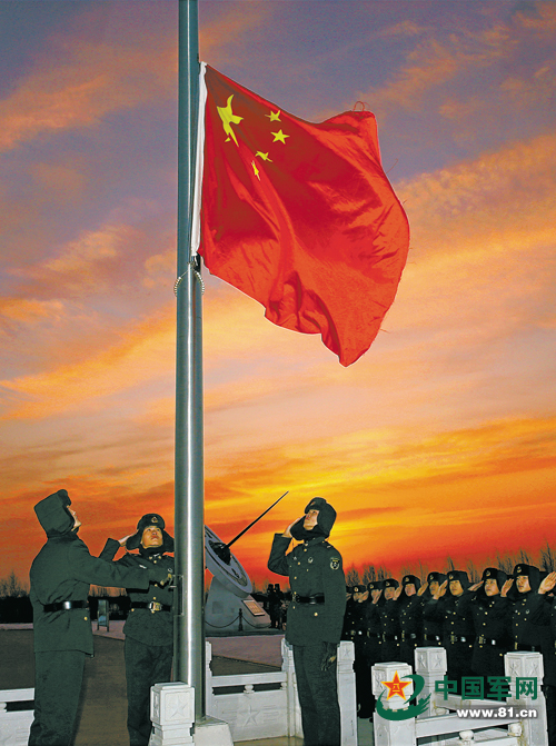 官兵们迎着初升的太阳举行升旗仪式。