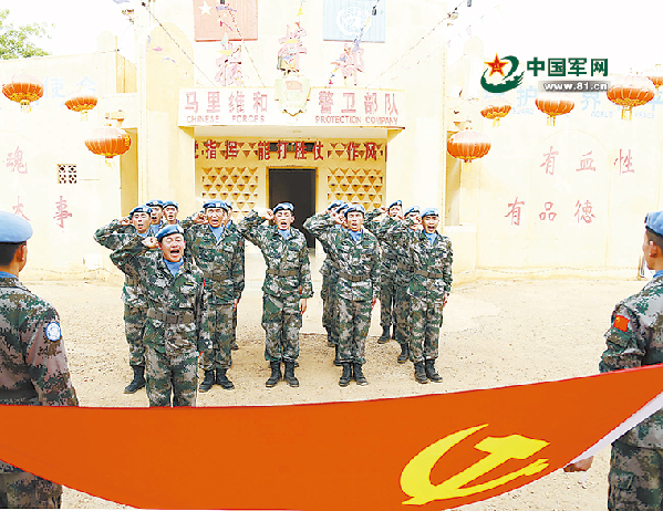 “我志愿加入中国共产党,拥护党的纲领……”一面鲜红的党旗下,第16集团军某机步旅2名蓝盔勇士英姿挺拔。铮铮誓言响彻马里上空,信仰的力量在西非大地升腾,那一刻,在维和营区,满眼都是火火的中国红。