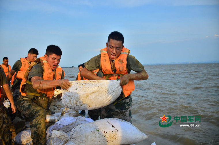 第12集团军百将团官兵在安庆望江县执行抗洪抢险任务