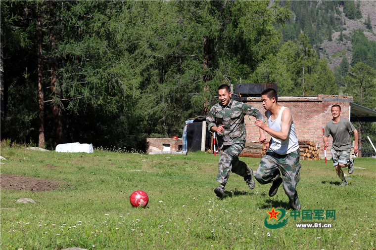 到达哨所已是下午6点。恰逢周五党团活动,在连队翻译伊麦尔江的带领下哨所官兵正进行一场激烈的足球赛,绿草如茵的天然球场上,官兵们热情高涨,欢乐的笑声划破苍穹,久久地回荡在这宁静的山谷。