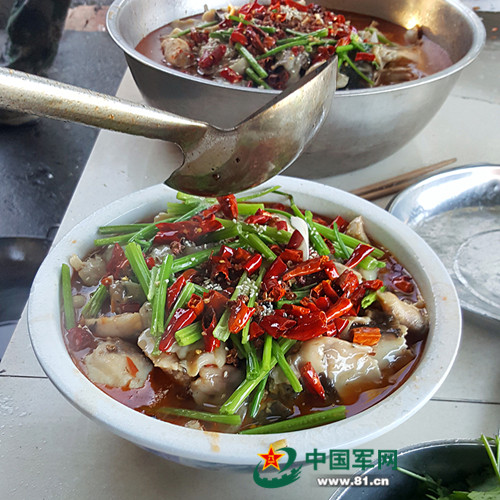 哨所长吴恒告诉笔者,哨所补给困难,新鲜食材难以存放。平时山上的肉类仅能存放一两天,为调剂好伙食保障,官兵想法设法搞花样,做家乡菜、创意菜:水煮鱼片、野葱炒蛋、野草菇炖熏鸡等等。