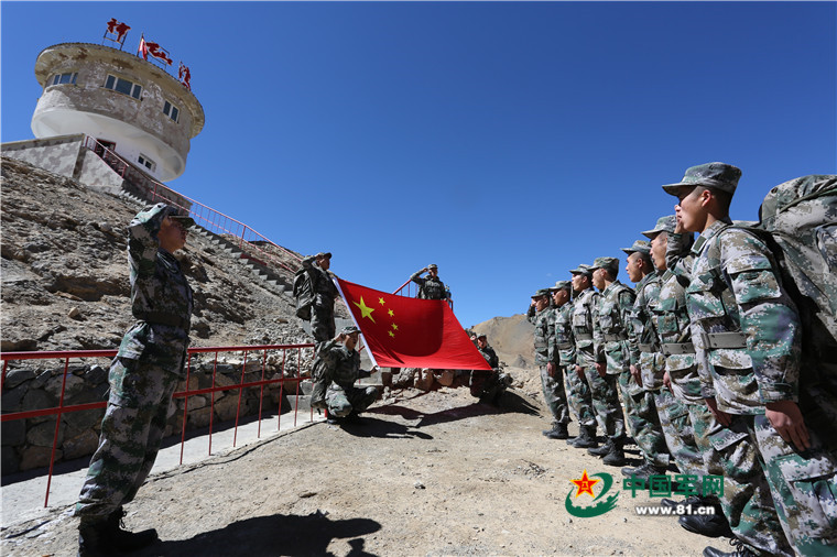 退伍老兵在自己曾经日夜坚守的哨楼旁,面向国旗庄严宣誓,永远做哨卡的光荣一兵,退伍不褪色。岳小平摄