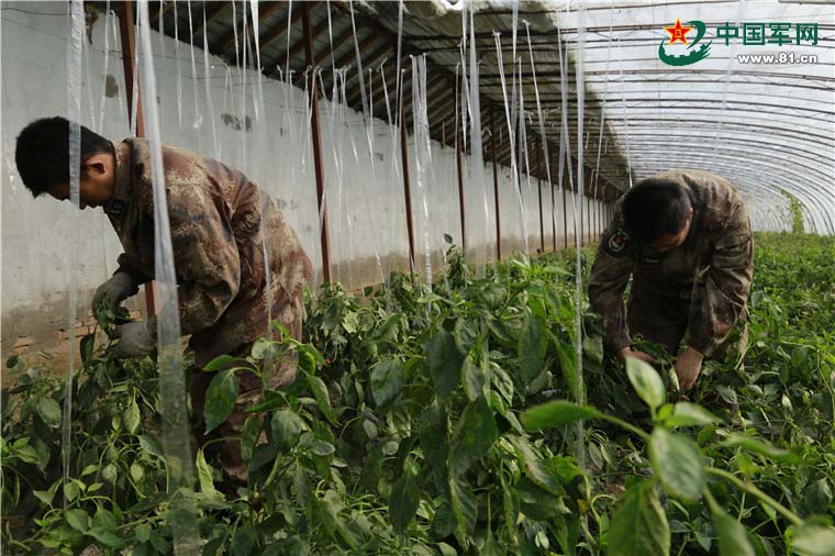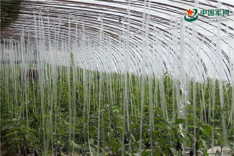该部种养殖基地官兵正在蔬菜大棚内悬挂吊绳,帮助农作物牵藤生长