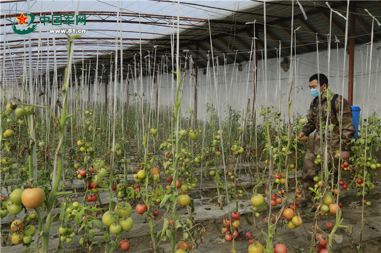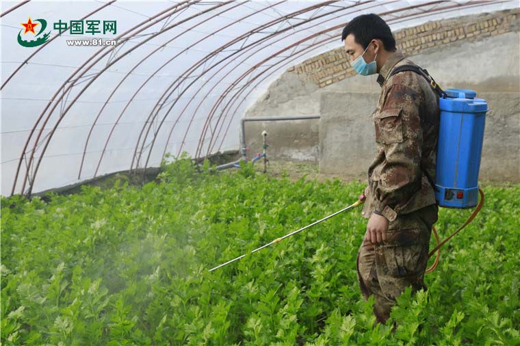 该部种养殖基地官兵正在为农作物喷洒抗寒剂,确保农作物产品不受冻。