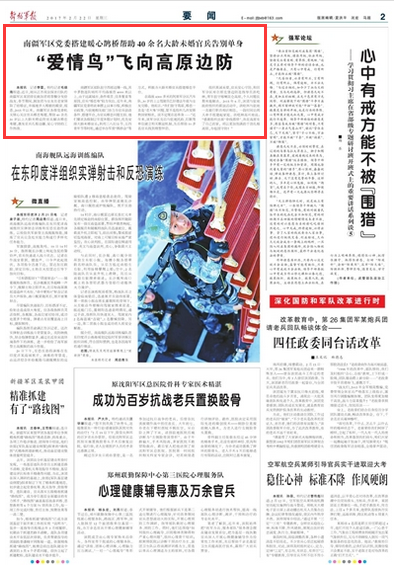 部队大龄未婚官兵多,这成了南疆军区党委的心头事。帮助他们解决婚恋难题,能充分激发官兵扎根边疆、安心守防的工作热情。今天《解放军报》刊登文章《“爱情鸟”飞向高原边防》,文章说,南疆军区党委将官兵婚恋问题摆上议事日程,积极出台政策,与驻地相关部门协力为官兵创造条件、搭建平台,为官兵婚恋问题支招。2015年以来,已帮助40余名30岁以上大龄未婚边防官兵解决了婚恋难题,