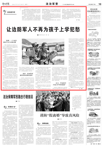 建章立制,依法优待。“军地双方联合修订下发军人子女入学优待规定,列出专项条款,开辟‘军娃优先入学’绿色通道。”某边防团政委陈晓军建议,应当对落实不力的单位和个人进行问责,真正让为国戍边的军人得到社会普遍尊崇。