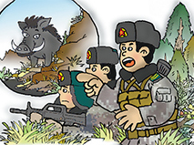 情况突然,参加巡逻不久的几名上等兵有些紧张。张朝富边观察边思忖:群居的野猪一般昼伏夜出,不会攻击人类,可今天为何会对他们“虎视眈眈”?一低头,他发现周围的松树皮都有被动物磨蹭的痕迹,树根下还有动物遗留的粪便,顿时恍然大悟。