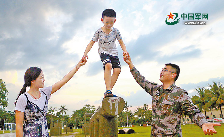 教导员李轩利用自由活动时间,和爱人陪儿子李沛隆练习过障碍,锻炼孩子的胆量。刘华摄