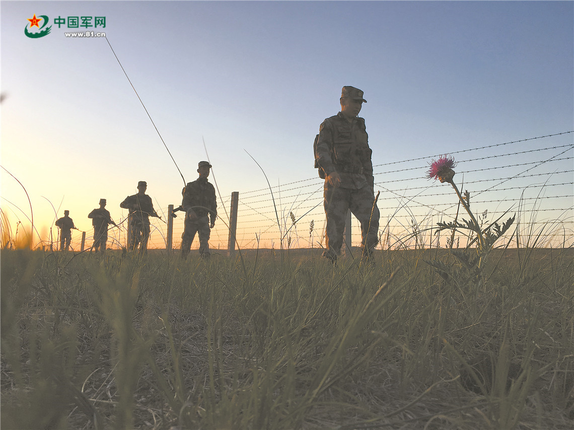 踏着落日的余晖,官兵们巡逻在祖国的边境线上。
